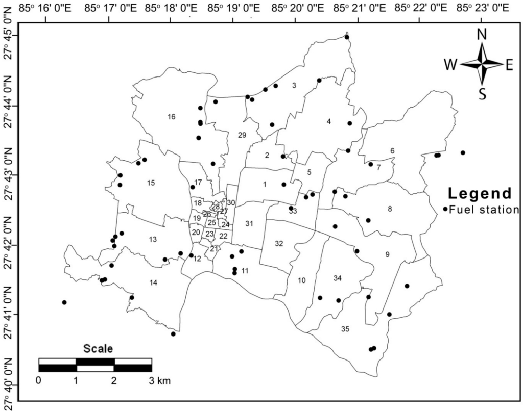 Map showing 35 wards of Kathmandu Metropolitan City with location