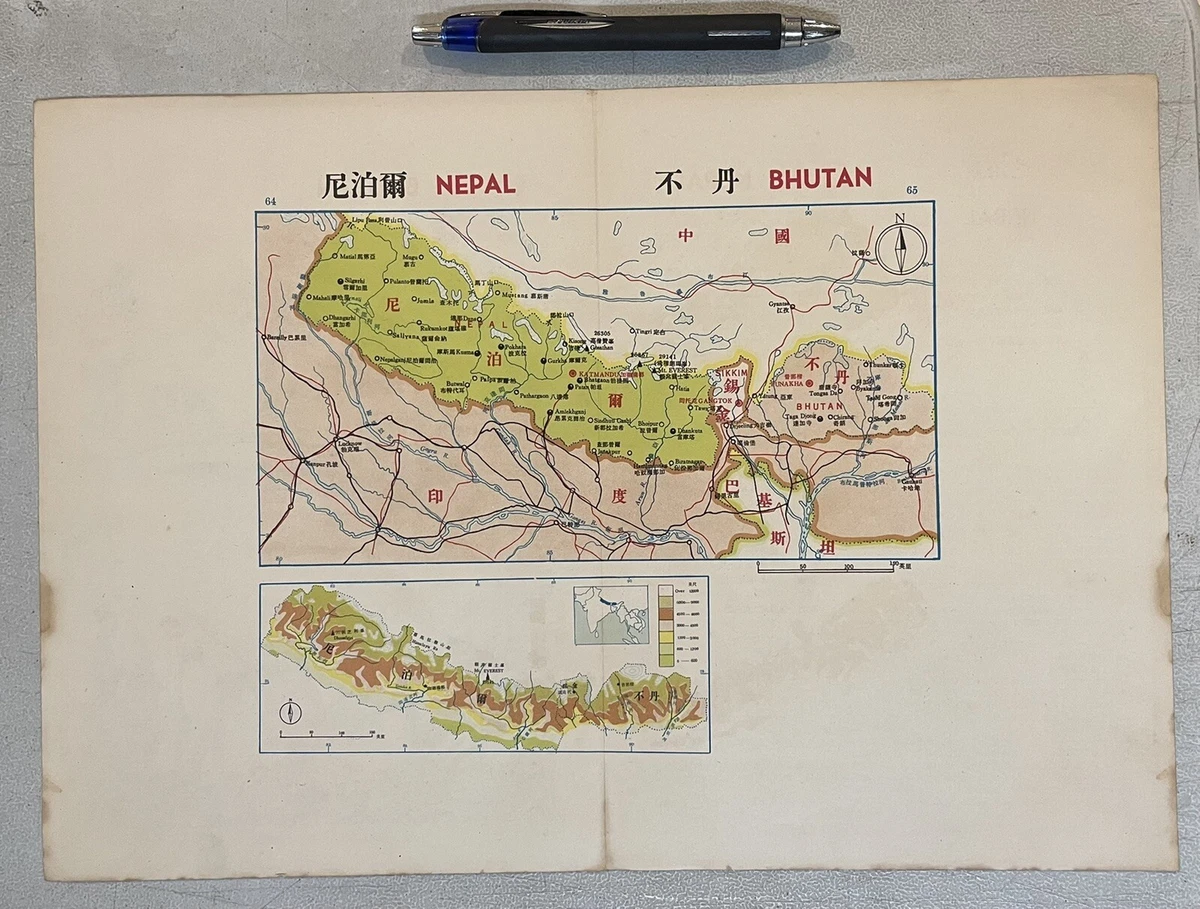 1950’s Nepal & Bhutan map page of an Altas book in English Chinese